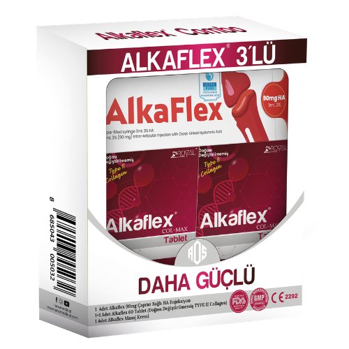 Alkaflex 3’lü Kombo, eklem sağlığına kapsamlı bir çözüm sunan avantajlı bir pakettir. İçeriğinde bulunan çapraz bağlı hiyalüronik asit enjeksiyonu, Tip 2 kolajen (kolojen) tabletleri ve masaj kremi ile eklem yapısını hem içeriden hem dışarıdan destekleyerek hareket konforunu en üst seviyeye taşır.